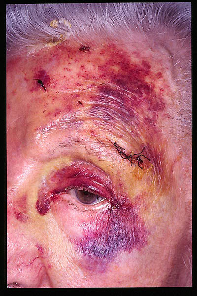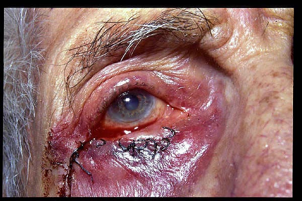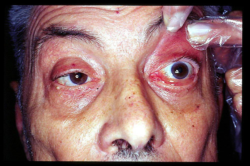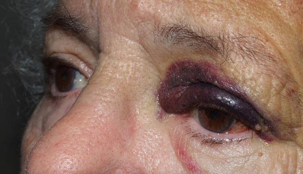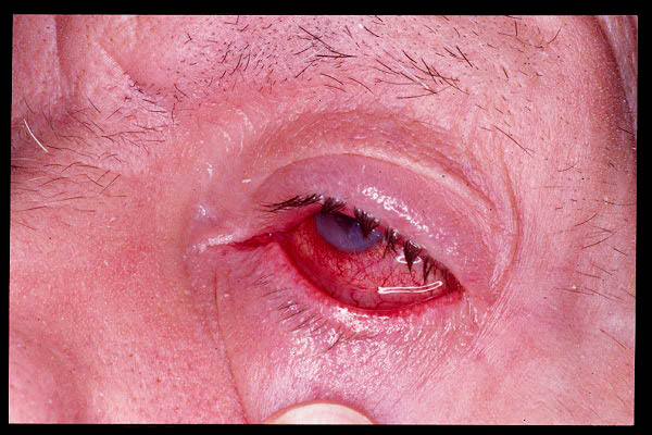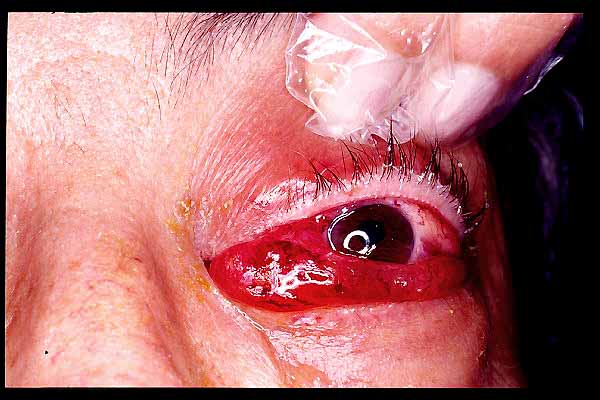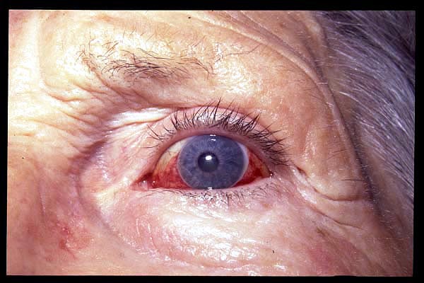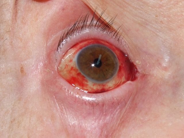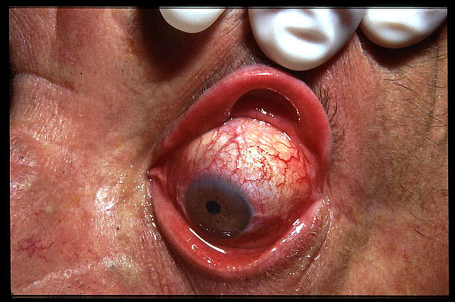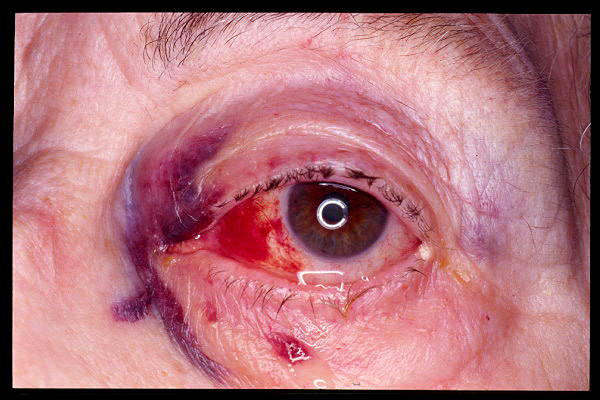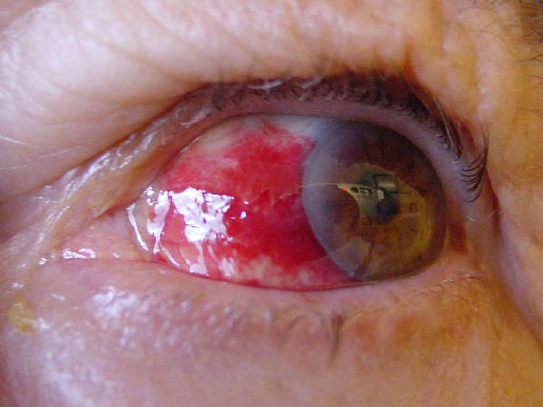 Fístula carótido-cavernosa postTCE con exoftalmos y quemosis.